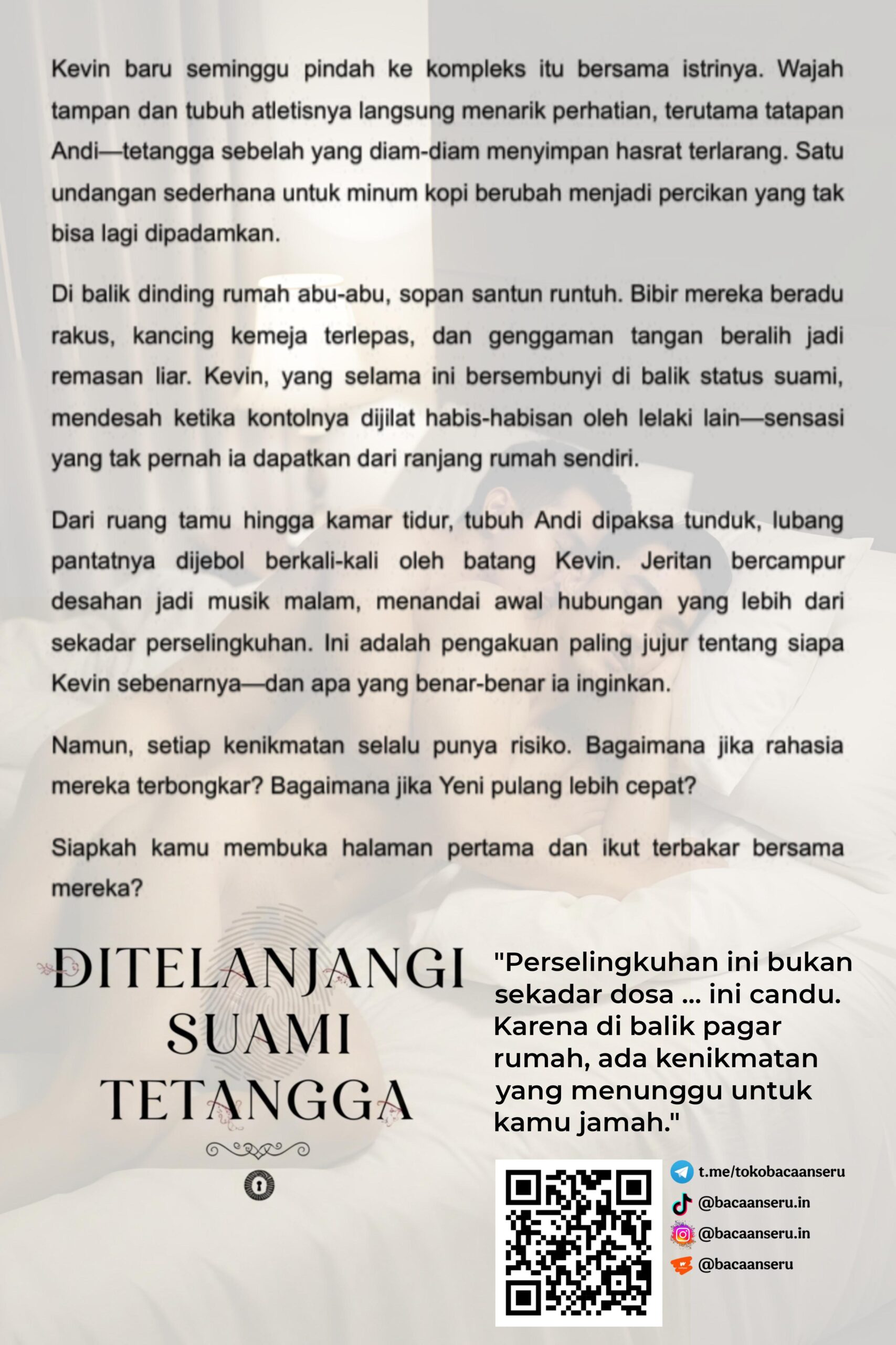 Awalnya sederhana, sekadar minum kopi sore di ruang tamu rumah Andi. Tapi obrolan ringan itu berubah panas ketika tangan mereka bersentuhan terlalu lama, ketika tatapan Andi menelusuri dada bidang Kevin tanpa malu. Kevin tahu, sesuatu dalam dirinya sudah lama ia sembunyikan: nafsu pada lelaki. Malam itu, saat istrinya pergi arisan dan tak pulang, Kevin akhirnya mengetuk pintu rumah abu-abu itu lagi… dan semua topengnya runtuh.