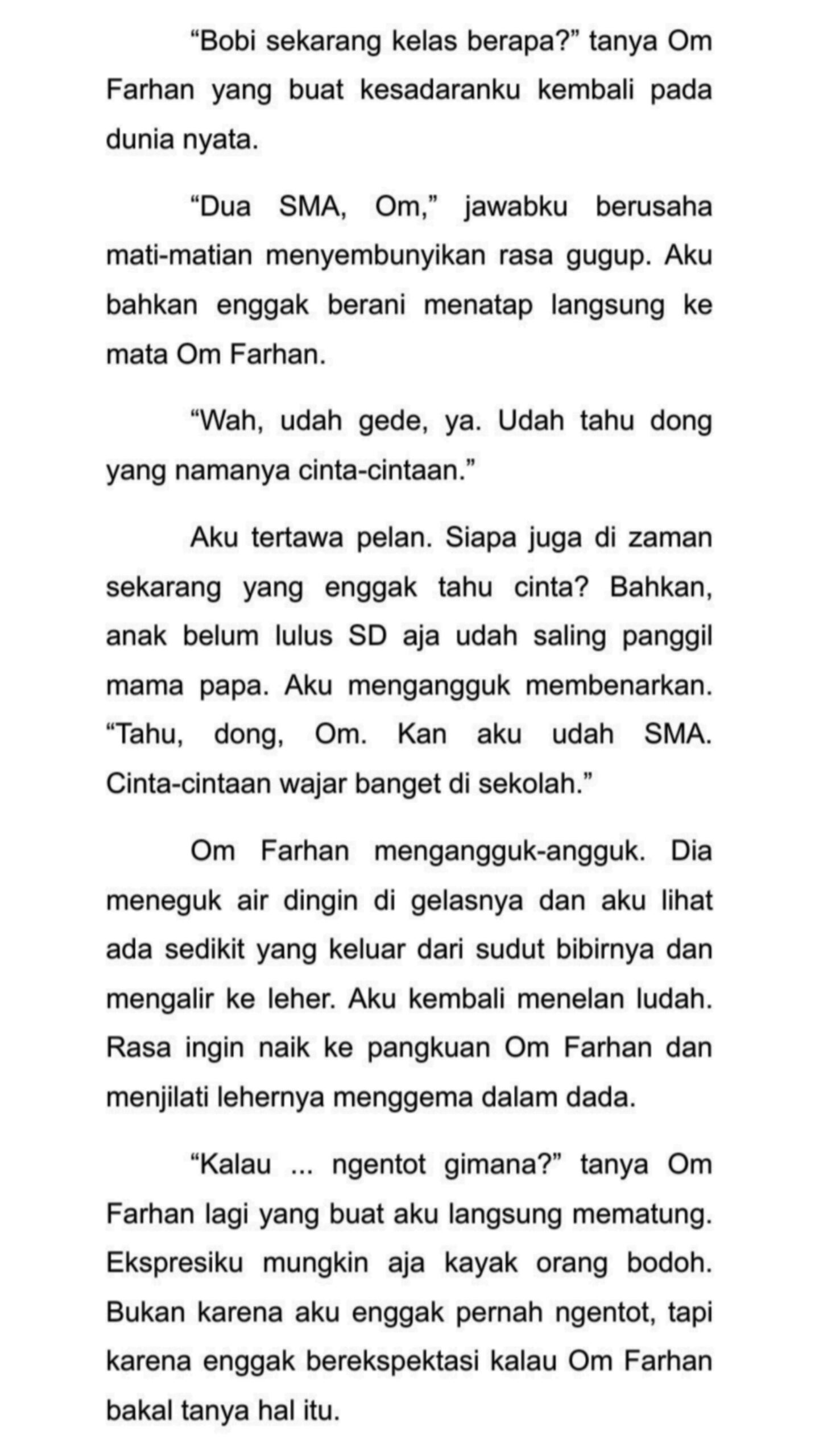 Bobi, remaja SMA yang penuh gejolak, terperangkap dalam pusaran nafsu tak terduga saat tinggal sementara di rumah Om Farhan-paman muda berbadan kekar yang menyimpan hasrat gelap. Apa yang dimulai sebagai pengawasan biasa berubah menjadi permainan bahaya: sentuhan yang “tak sengaja”, bisikan menggoda di kegelapan, dan eksplorasi tubuh yang melampaui batas kekerabatan.
