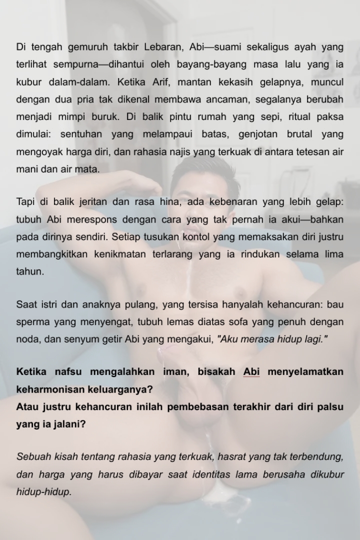 Di tengah gemuruh takbir Lebaran, Abi-suami sekaligus ayah yang terlihat sempurna dihantui oleh bayang-bayang masa lalu yang ia kubur dalam-dalam. Ketika Arif, mantan kekasih gelapnya, muncul dengan dua pria tak dikenal membawa ancaman, segalanya berubah menjadi mimpi buruk. Di balik pintu rumah yang sepi, ritual paksa dimulai: sentuhan yang melampaui batas, genjotan brutal yang mengoyak harga diri, dan rahasia najis yang terkuak di antara tetesan air mani dan air mata.