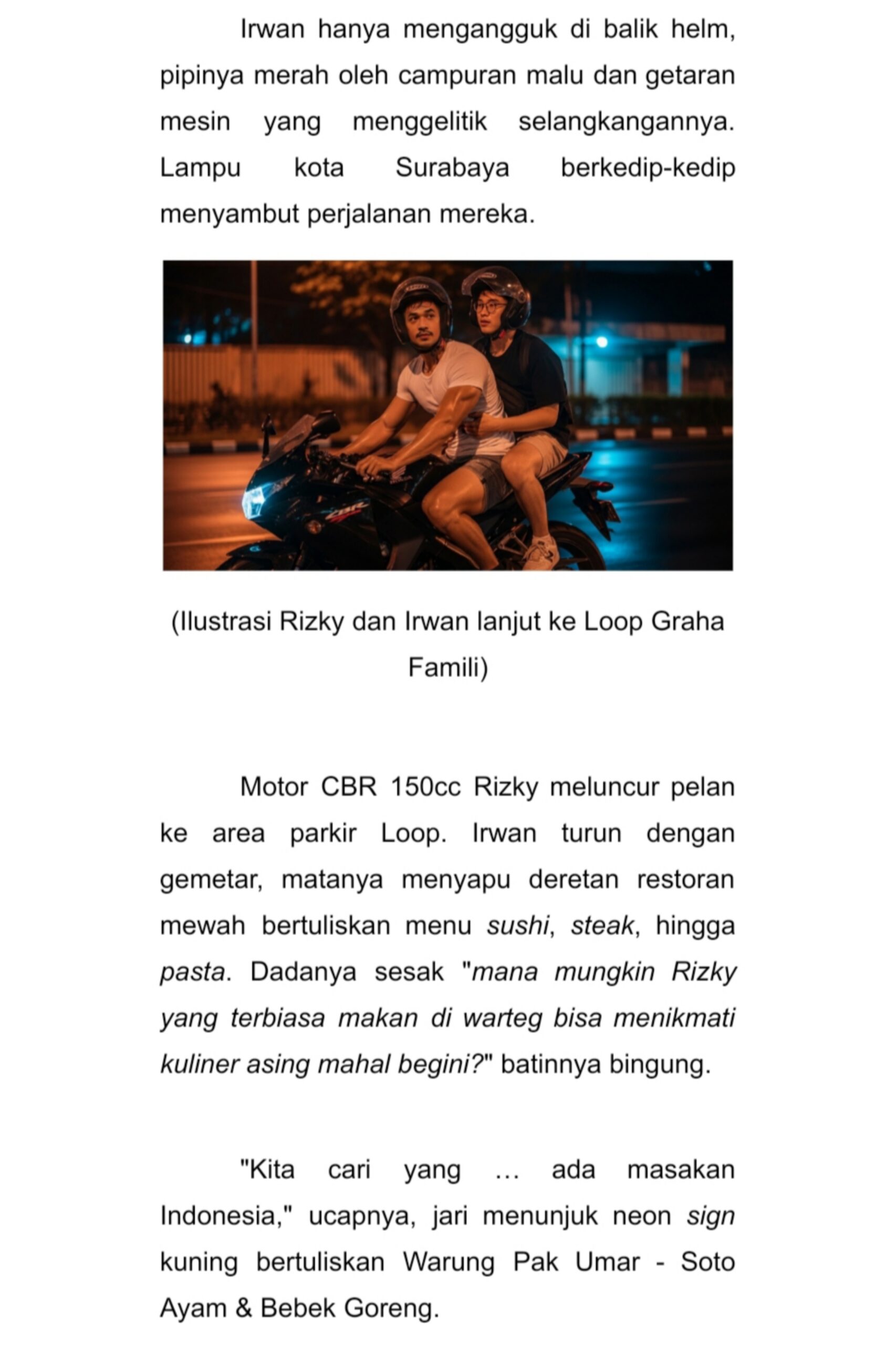 Sampai akhirnya, setelah satu perjalanan malam dan sebotol wine di apartemen lantai lima belas, Irwan sadar: mungkin hidupnya memang butuh sedikit kekacauan agar bisa terasa hangat.