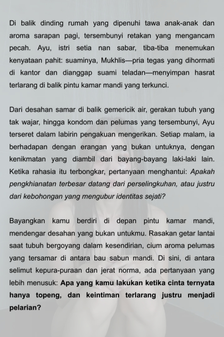 Dari desahan samar di balik gemericik air, gerakan tubuh yang tak wajar, hingga kondom dan pelumas yang tersembunyi, Ayu terseret dalam labirin pengakuan mengerikan. Setiap malam, ia berhadapan dengan erangan yang bukan untuknya, dengan kenikmatan yang diambil dari bayang-bayang laki-laki lain. Ketika rahasia itu terbongkar, pertanyaan menghantui: Apakah pengkhianatan terbesar datang dari perselingkuhan, atau justru dari kebohongan yang mengubur identitas sejati?