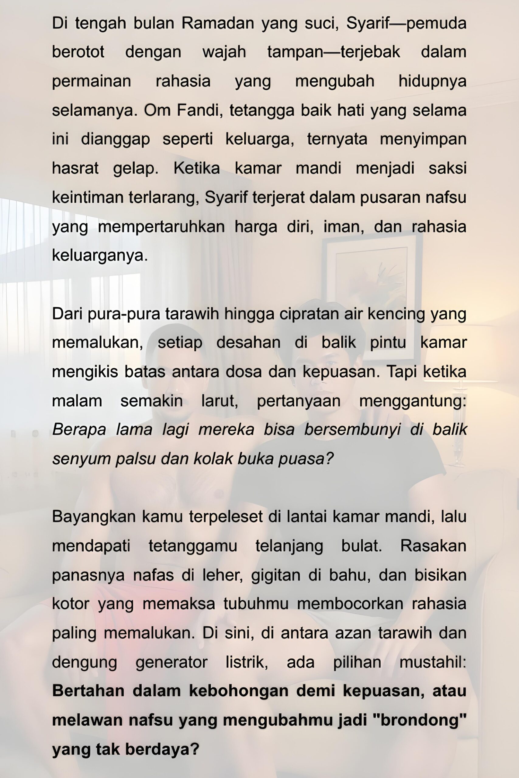 Di tengah bulan Ramadan yang suci, Syarif—pemuda berotot dengan wajah tampan terjebak dalam permainan selamanya. Om Fandi, tetangga baik hati yang selama ini dianggap seperti keluarga, ternyata menyimpan hasrat gelap. Ketika kamar mandi menjadi saksi keintiman terlarang, Syarif terjerat dalam pusaran nafsu yang mempertaruhkan harga diri, iman, dan rahasia keluarganya.